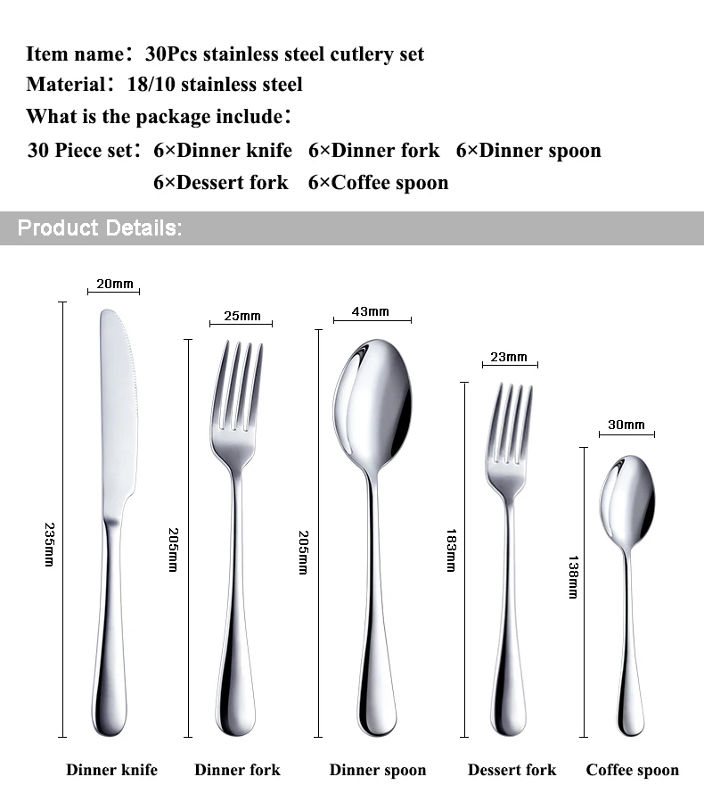 Quantity of a set: 6 dinner knives+6 fork+6 spoon+6 dessert fork+6 tea spoon